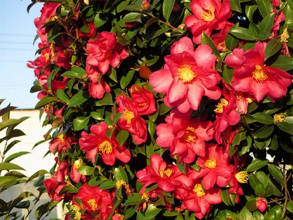 夕日を浴びて、オレンジ色を帯びたサザンカ。これも、また良いもんで。 何日か前は、こんなに花が咲いてなかったんで、ここ数日の暖かさで一気に咲いたんでしょうねぇ。 1月に咲く花は少ないんで、メッチャ目立ってます。
