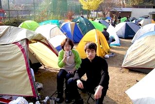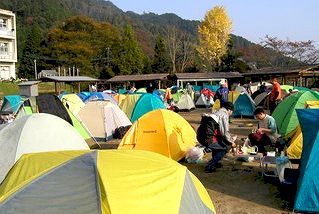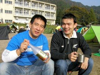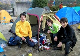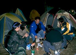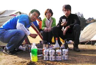 「もけも犬小屋」テントを中心に、昼の部記念撮影! 陽射しがある間は暑いくらいで、TシャツでOKでした。 温泉家は、買い出し部隊として大活躍! ウィンナー、焼き鳥、豆腐、ポン酢、ビールなどなど、食料を調達してきてくれました。ありがとー! もけも犬が肉球で竹串刺して、湯がいたねぎみそコンニャクもイケましたなあ。ごちそうさん。 |