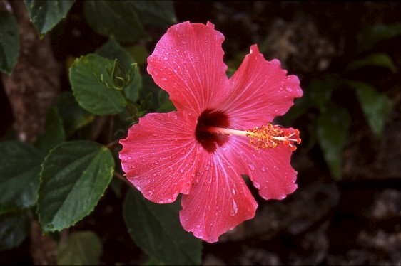 そんな雨上がり、水滴を付けたハイビスカスを見つけました。まるで島の暑さで汗をかいてるかのような……。