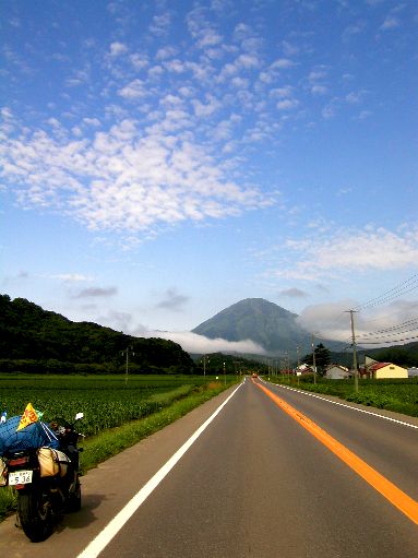 国道の彼方に堂々と立ちはだかる尻別岳。