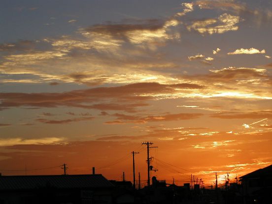 夕方の空。雲がオレンジに色づいている。今日はいい夕焼けになるぞ。