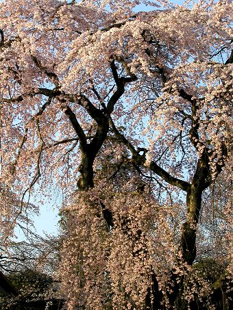 夕陽を浴びた枝垂れ桜 滝のような花びら