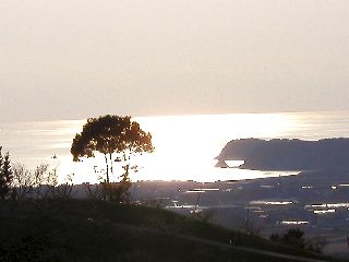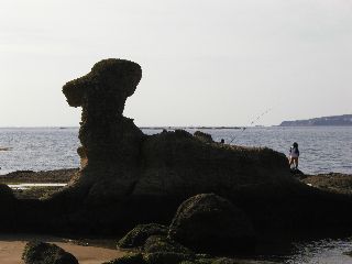 ウミガメが産卵に来るほどきれいな千里の浜。その丘陵一帯に咲く千里梅林。 見学コースがあるわけでなく、自分でポイントを見つけながら、梅を楽しむ。 気が付くと浜まで降りてきていた。きれいな砂浜だ。波音を聞きながら、ぼけーっとする。 そこで見つけた、ダックスフンドの顔を持つスフィンクス岩。これで耳がついてたら完璧なのに、と思ってしまった! 案内板によると夕日のポイント。釣り糸を垂れながら観る夕日もよかろうなあ。
