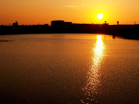 <大阪府堺市深井> 1日走った彼岸花ツーリングの最後は、秋の夕日。オレンジ色に染まる池に、涼しげな風が吹く。 |