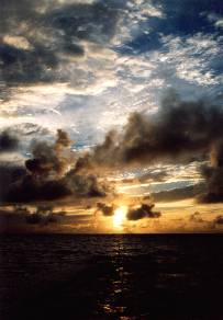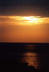 <夕日> 米原の海で泳いだ帰り、海パンのまま乾かしながら走った。でも今年はちょっとさぶい。 名蔵湾に出ると、夕焼けが待っていてくれた。右手に眺めながら、海沿いの道を走る。 雲に隠れ気味の夕日が、時折サッと雲間から差込み、光の帯で海を照らす。なんともいえない風景だった。 フサキに近付くと、その雲を抜けた夕日が、海を鮮やかなオレンジ色に染める。 砂浜に出て、陽が沈むまで眺めていた。 |