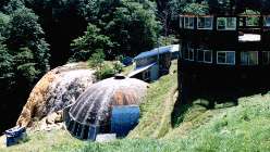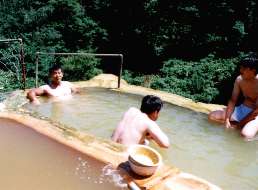 露天風呂は、まさにドーム要塞のような形で、茶色い鉱泉である。さすがに30度を越える気温では、湯あたりしてクラクラしそうだ。風呂に入って、背中を日焼けするなんて! きっともう少し涼しければ、いい湯加減なんだよなあ。緑を眺める景色も最高。