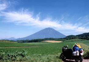 ■8月8日(9日目・最終日) キャンプ場の朝は、アヒルのグワァグワァという鳴き声で起こされた。4時だった。でもおかげで早起き。テントから出ると、霧で真っ白。テントも濡れてる。乾かしてる時間はないので、そのまま畳むしかない。 6時発、札幌を目指す。霧が晴れていくのと同じスピードで駆けて行く。定山渓の向こう中山峠では、地元のサンデーライダーがたくさん走っていてにぎやか。そして、羊蹄山が見えた! 9年目にして、ようやく雲がかかっていない姿を見て、カンドー! まさに富士山。その形の美しさに見惚れてしまう。 今日はメチャメチャいい天気。とにかく暑い。腕が真っ赤に焼けて痛いのだ。羊蹄山を眺めながら、真狩村への道を走る。ところが睡眠不足がたたって、目が開けていられないくらい痛くなった。涙を流しながら走るも、もう限界。小学校で一休み。