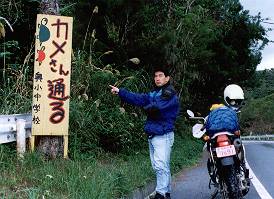 雑誌で見かけた「カメさん通る」の看板を発見! やんばるに住むリュウキュウヤマガメのことだそうです。 |