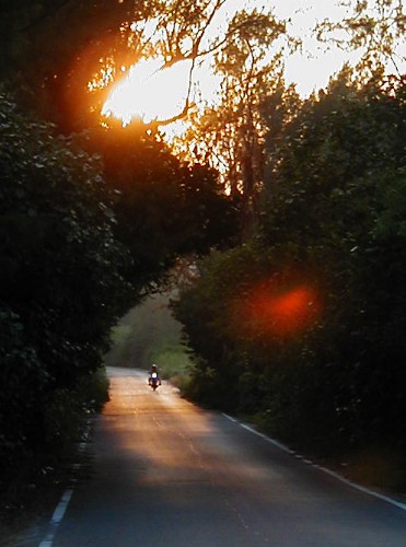 石垣島・名蔵。緑の茂る中を走ってきた1台のバイク。夕日に輝く道をすべるようにやってくる。家路へと急ぐのか。南の島の静かな夕景。