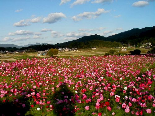 夕方、甘樫丘の前を走っていると、華やかなコスモスが目に飛び込んで急停車! 思わず、ほぉ〜っと声が出てしまう。 どちらかといえば地味な感じの明日香の里が、とても着飾って見えた。 (01年11月4日撮影)