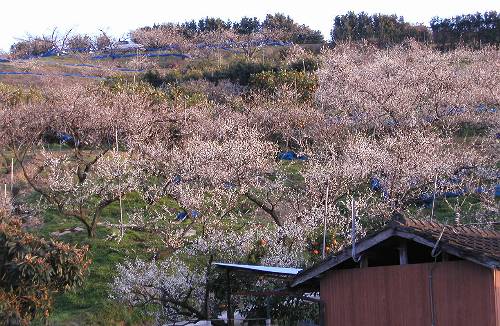 梅林のハイキングコースをトコトコと歩く。梅の香りに誘われて。 あと少しでゴール……、ふと、気になって振り返ると、夕陽に照らされた梅たちが鮮やかに映えていた。 まるで歌ってるみたいだなあと思った。 (02年2月16日撮影)