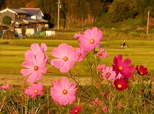 夕暮れ染まる景色の中で、コスモスを見つけた。