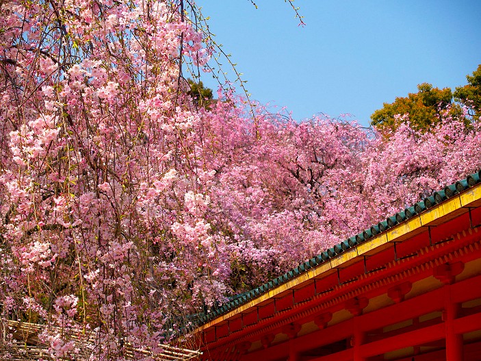 平安神宮・神苑に咲く、降るような紅枝垂れ桜