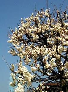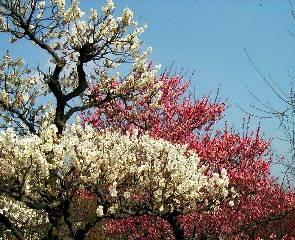 紅梅と白梅の見事な競演! 目に焼き付く真っ赤な梅と、枝振りも見事な白梅を見つけて、思わず、ほぉーっという声を上げてしまいました。 |