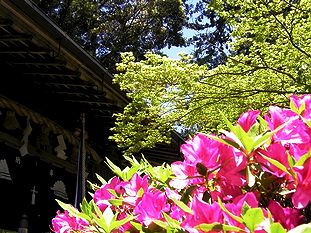 ![]() ツツジと新緑が織りなすコントラスト 高鴨神社の拝殿前 |